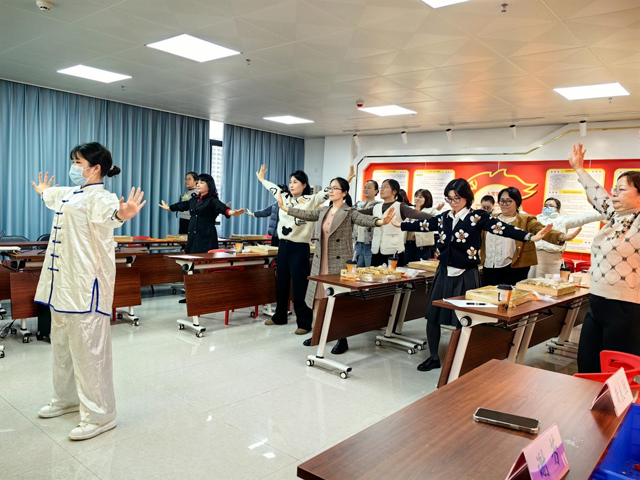 授課過程中,講師還為女職工設(shè)置了中醫(yī)文化體驗(yàn)環(huán)節(jié)。專業(yè)的中醫(yī)養(yǎng)生教練身著傳統(tǒng)服飾,身姿矯健地站在前方,為女職工們示范八段錦的標(biāo)準(zhǔn)動(dòng)作。“雙手托天理三焦,左右開弓似射雕……” 教練一邊口中念念有詞,一邊緩緩展示著一招一式,動(dòng)作行云流水、剛?cè)嵯酀?jì)。練習(xí)過程中,女職工們屏氣斂息,專注于每一個(gè)動(dòng)作的細(xì)節(jié),感受著身體的拉伸與舒展,仿佛在一招一式間與古老的中醫(yī)養(yǎng)生智慧對話。八段錦不僅讓女職工們體驗(yàn)到傳統(tǒng)健身方式的魅力,更在動(dòng)靜結(jié)合中舒緩了身心壓力,調(diào)節(jié)了氣息。許多女職工表示,練習(xí)完八段錦后,身體微微發(fā)熱,整個(gè)人都神清氣爽,仿佛充滿了能量。