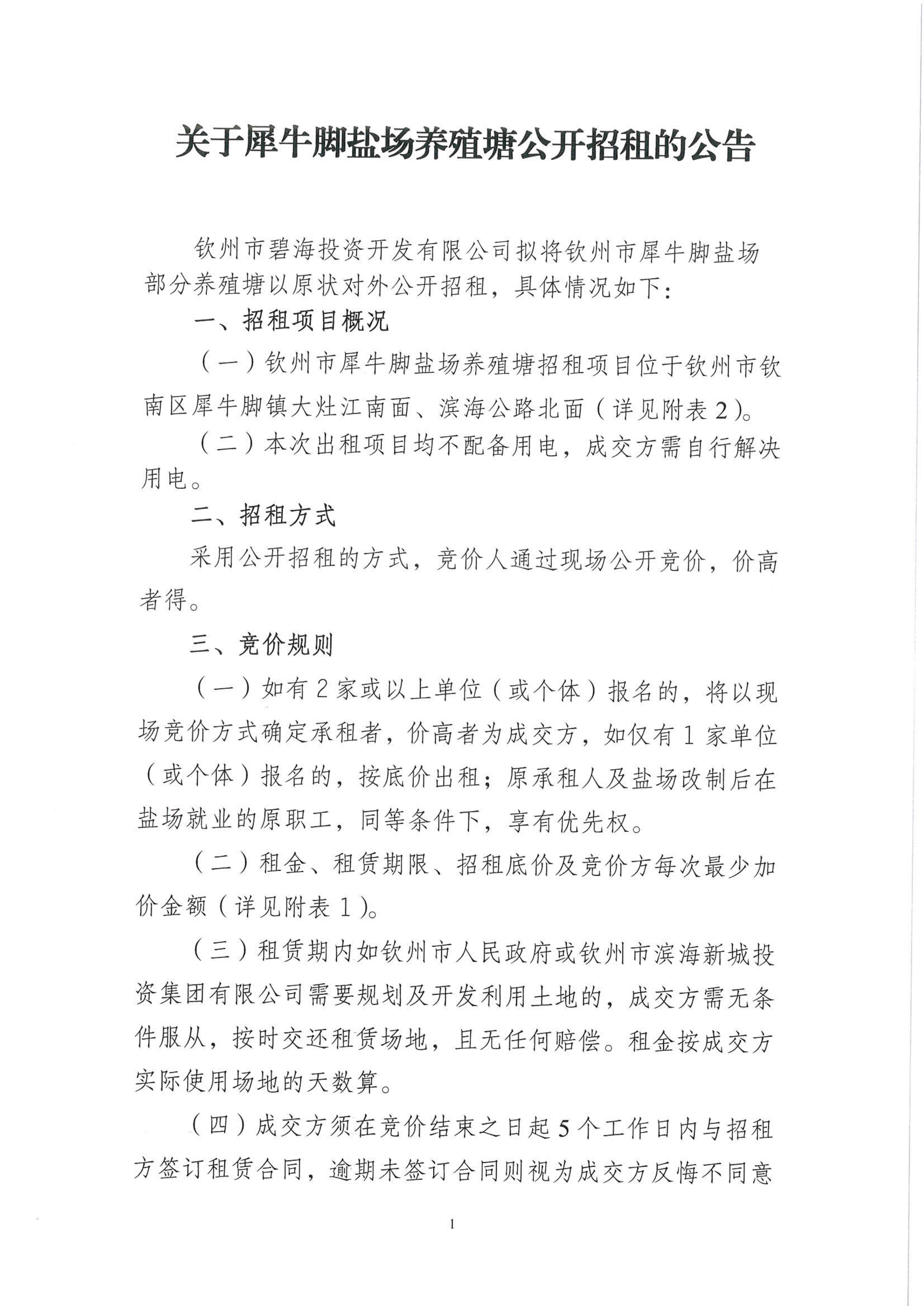 關于犀牛腳鹽場養(yǎng)殖塘公開招租的公告