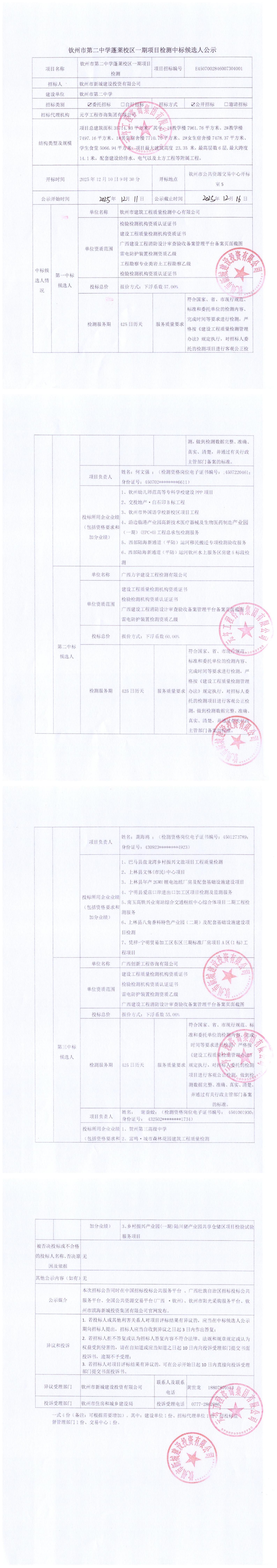 欽州市第二中學蓬萊校區(qū)一期項目檢測中標候選人公示