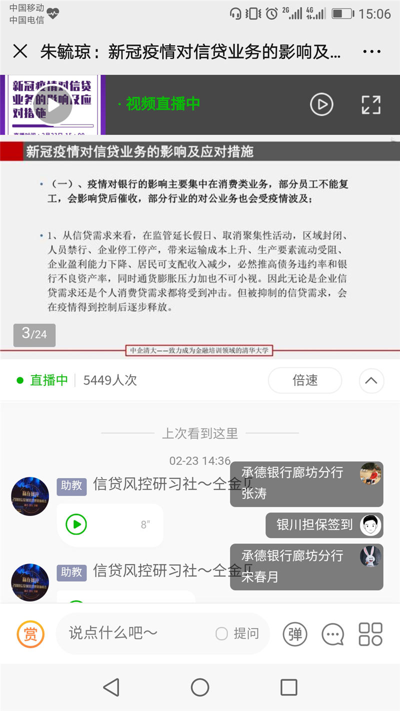 2020年2月23日下午,我公司員工集體參加銀行信貸風(fēng)險(xiǎn)專家朱毓瓊老師主講的“新冠疫情對(duì)信貸業(yè)務(wù)的影響及應(yīng)對(duì)措施”專題網(wǎng)課。通過本次網(wǎng)課培訓(xùn),系統(tǒng)地學(xué)習(xí)了解新冠疫情對(duì)融資擔(dān)保行業(yè)的影響,充分認(rèn)識(shí)本次新型冠狀病毒肺炎疫情對(duì)融資擔(dān)保行業(yè)的影響和沖擊,以及學(xué)習(xí)各地監(jiān)管部門的最新政策和應(yīng)對(duì)措施。