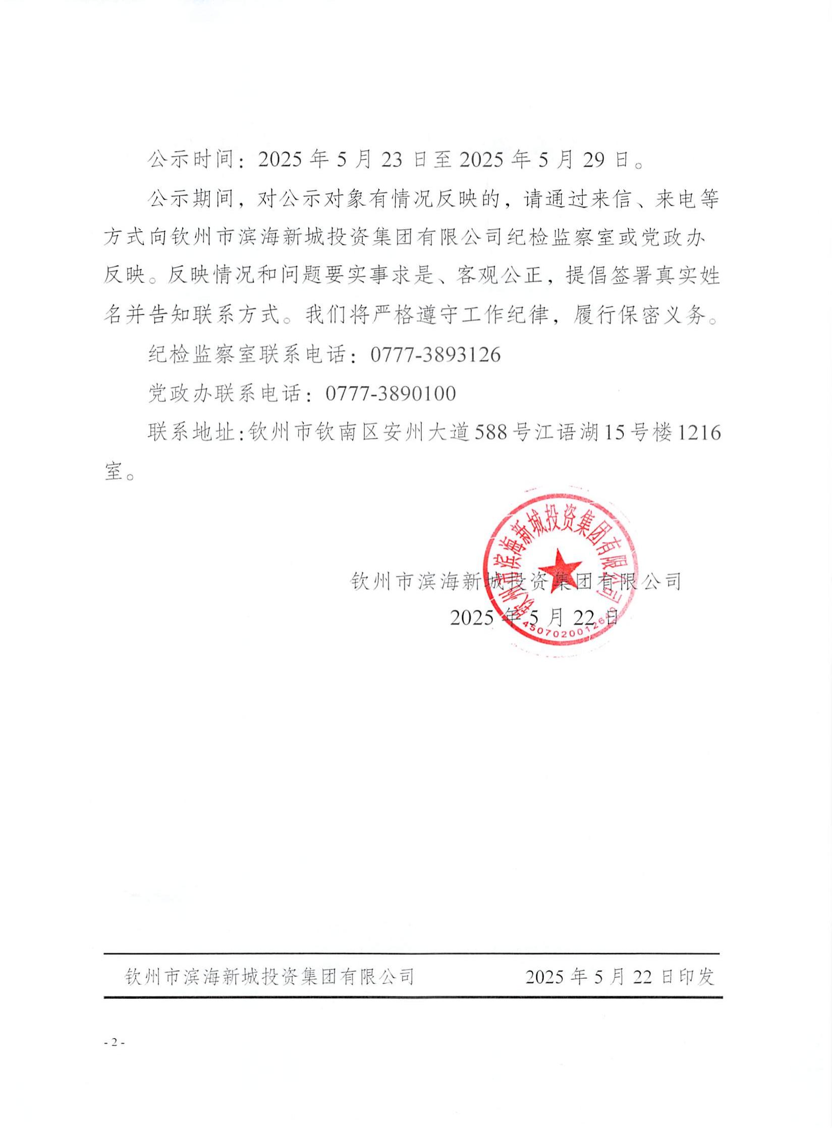 欽州市濱海新城投資集團(tuán)有限公司2025年公開招聘工作人員擬聘用人選公示