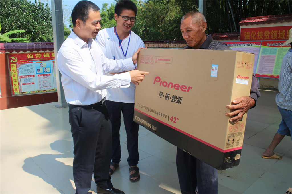 圖為集團(tuán)公司總經(jīng)理覃世金為貧困戶發(fā)放電視機(jī)