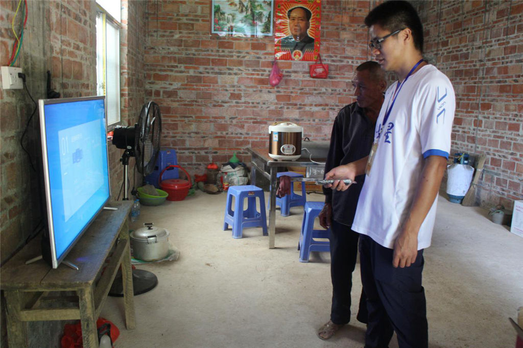圖為工作人員為貧困戶安裝電視機(jī)