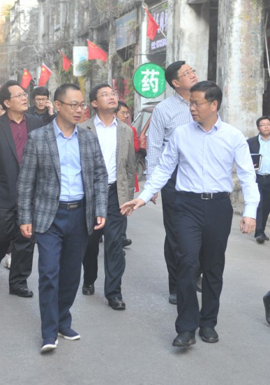 譚丕創(chuàng)市長沿著中山路步行至占鰲巷,實地調(diào)研歷史文化街區(qū)保護和老城區(qū)改造提升工作,聽取了集團公司董事長趙文博對中山路、占鰲巷、蘇廷有故居的提升改造匯報工作。