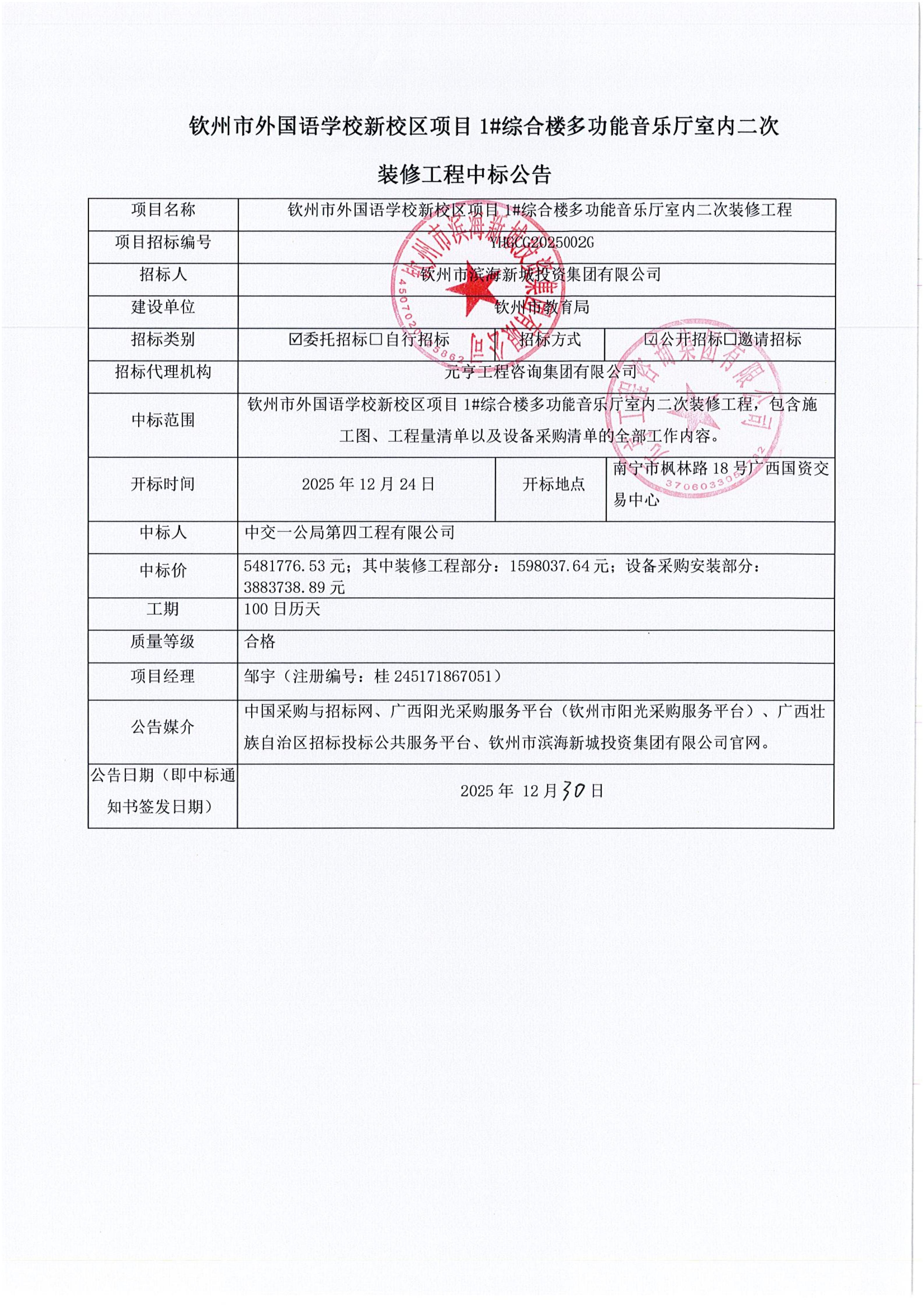 欽州市外國語學校新校區(qū)項目1#綜合樓多功能音樂廳室內二次裝修工程中標公告