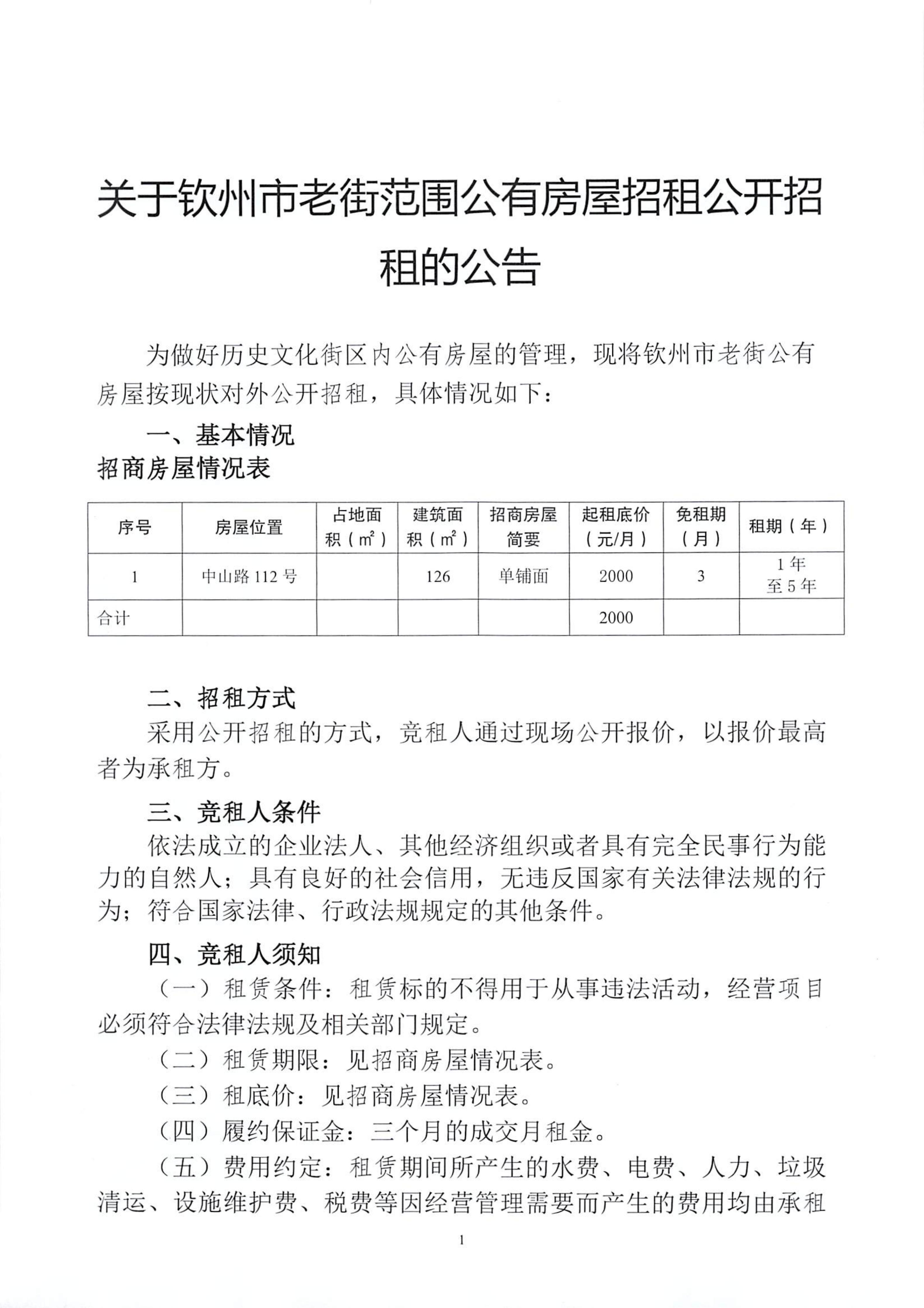 關(guān)于欽州市老街范圍公有房屋招租公開招租的公告