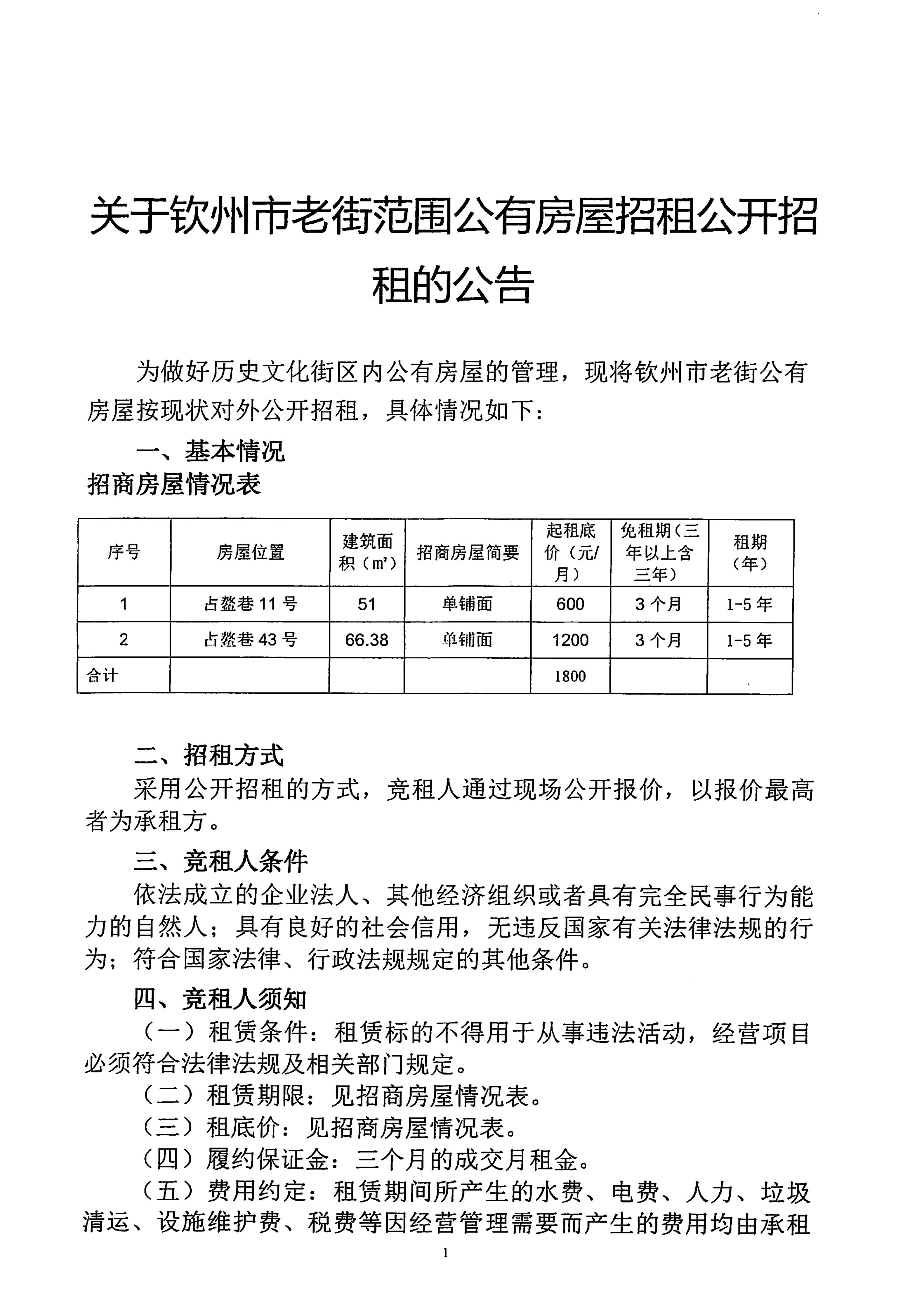 欽州市老街范圍公有房屋公開招租的公告(占鰲巷11號、占鰲巷43號)